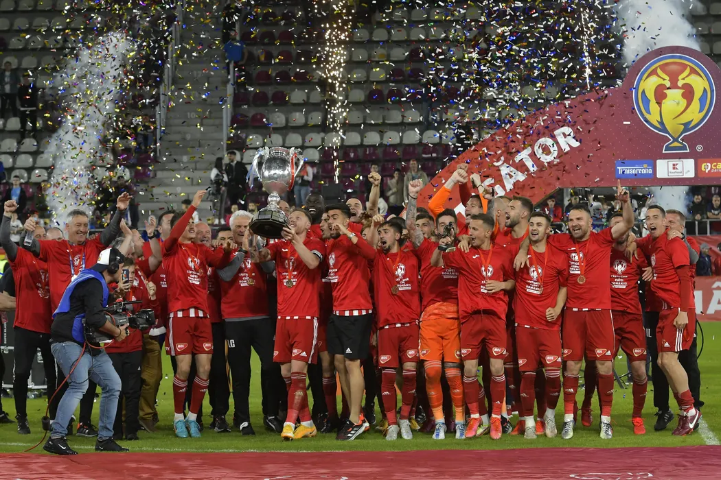 Fotbalistii si staff-ul de la Sepsi OSK Sfantu Gheorghe se bucura intr-o fotografie de grup realizata dupa castigarea Cupei Romaniei in urma meciului impotriva celor de la FC Voluntari, desfasurat pe Stadionul Rapid din Bucuresti, joi 19 mai 2022. © FOTO:Razvan Pasarica/SPORT PICTURES