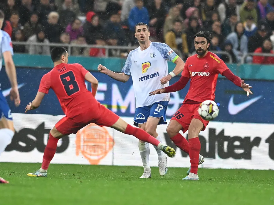 Adrian Gheorghe Sut, Ionut Justinian Larie si Andrea Compagno in meciul de fotbal dintre FCSB si Farul Constanta, contand pentru Play-off-ul Superligii Superbet, desfasurat pe Arena Nationala din Bucuresti, luni 17 aprilie 2023. © FOTO:Razvan Pasarica/SPORT PICTURES
