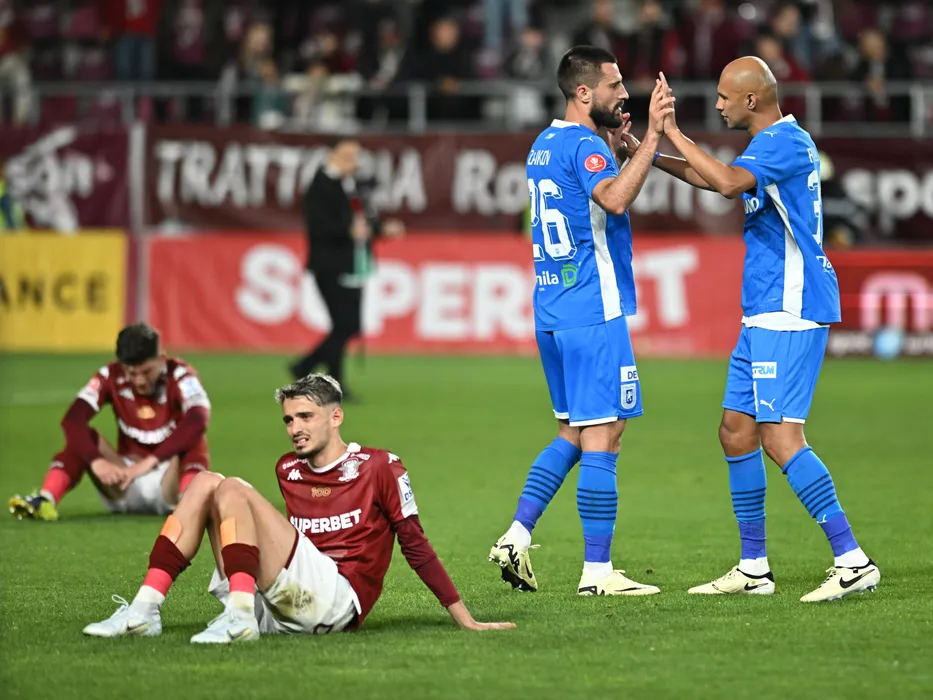 Gjoko Zajkov si Raul Michel Melo Da Silva se felicita alături de Albion Rrahmani la pamant dupa meciul de fotbal dintre Rapid Bucuresti si Universitatea Craiova, din cadrul Play off-ului Superligii Superbet, desfasurat pe Superbet Arena-Giulesti din Bucuresti, luni 29 aprilie 2024. © FOTO:Razvan Pasarica/SPORT PICTURES
