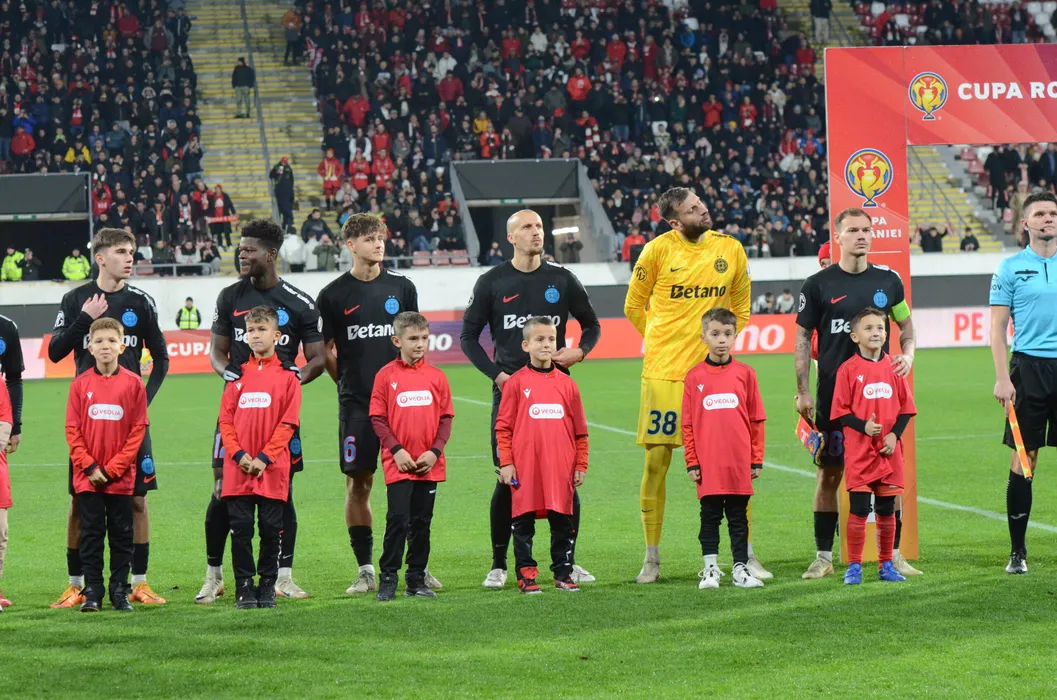 Fotbalistii ros-albastrii la startul meciului de fotbal dintre UTA Arad si FCSB, contand pentru Cupa Romaniei Betano, desfasurat pe Arena Francisc Neuman din Arad, miercuri 3 decembrie 2025. © FOTO:Alexandra Cristina Grigorescu/SPORT PICTURES