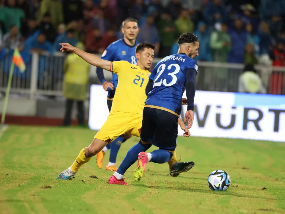 Olimpiu Moruţan si Leart Paqarada in meciul de fotbal dintre Kosovo si Romania, contand pentru Preliminariile Campionatului European, desfasurat pe Stadionul Fadil Vokrri din Pristina, vineri 16 iunie 2023.© FOTO SPORT PICTURES