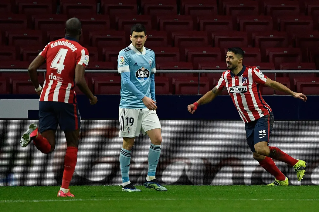 Atletico Madrid's Uruguayan forward Luis Suarez (R) celebrates after scoring a second goal during the Spanish league football match between Club Atletico de Madrid and RC Celta de Vigo at the Wanda Metropolitano stadium in Madrid on February 8, 2021.,Image: 589715671, License: Rights-managed, Restrictions: , Model Release: no
