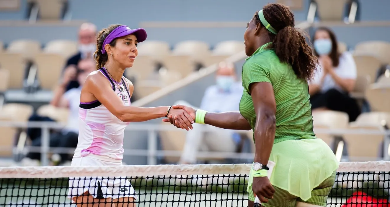 Mihaela Buzarnescu of Romania & Serena Williams of the United States after their second-round match at the 2021 Roland Garros Grand Slam Tournament