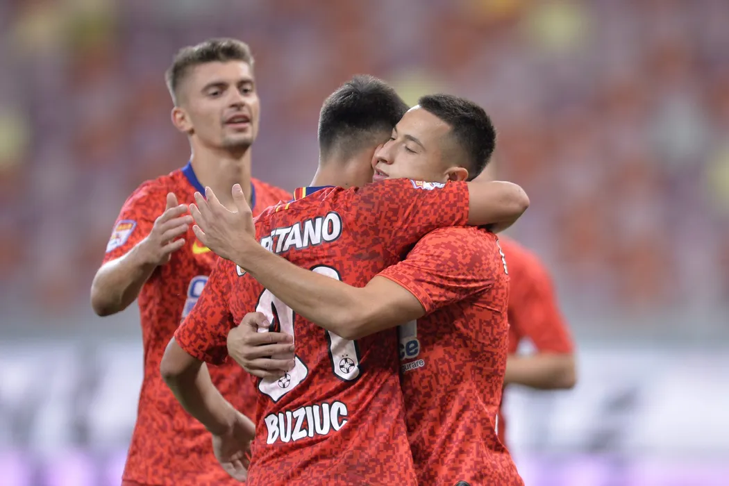 Alexandru Buziuc de la FCSB este felicitat de colegi dupa ce a marcat in partida cu Shirak (Armenia), partida disputata in turul 1 al Ligii Europa, joi 27 august 2020, pe Arena Nationala din Bucuresti. ALEXANDRU DOBRE / MEDIAFAX FOTO