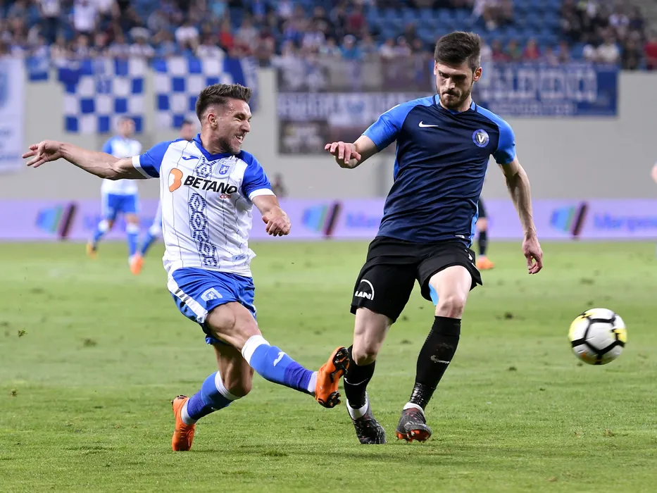 Alexandru Baluta si Robert Hodorogea in meciul de fotbal dintre CS Universitatea Craiova si FC Viitorul, din cadrul play off-ul Ligii 1 Betano, desfasurat pe Stadionul Ion Oblemenco din Craiova, sambata 28 aprilie 2018. © FOTO Razvan Pasarica/SPORT PICTURES