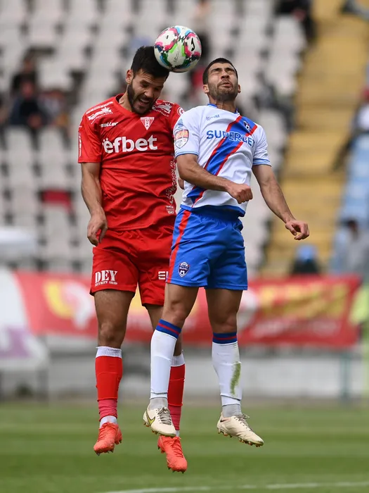 Andrei Chindris si Eduardo Sampaio Feitoza Dudu in meciul de fotbal dintre Gloria Buzau si UTA Arad, contand pentru mansa tur a barajului pentru promovarea in Superliga Superbet, desfasurat pe Stadionul Gloria din Buzau, duminica 28 mai 2023. © FOTO:Razvan Pasarica/SPORT PICTURES