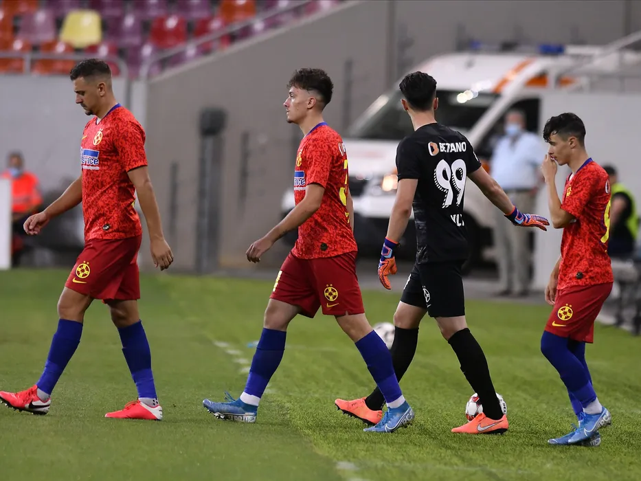 Fotbașlistii stelisti George Andrei Miron, Andrei Istrate si Romeo Adrian Nita intra pe teren in meciul de fotbal dintre FCSB si CFR Cluj, contand pentru play-off-ul Ligii 1 Casa Pariurilor, disputat fara spectatori pe Arena Nationala din Bucuresti, vineri 31 iulie 2020. © FOTO:Razvan Pasarica/SPORT PICTURES