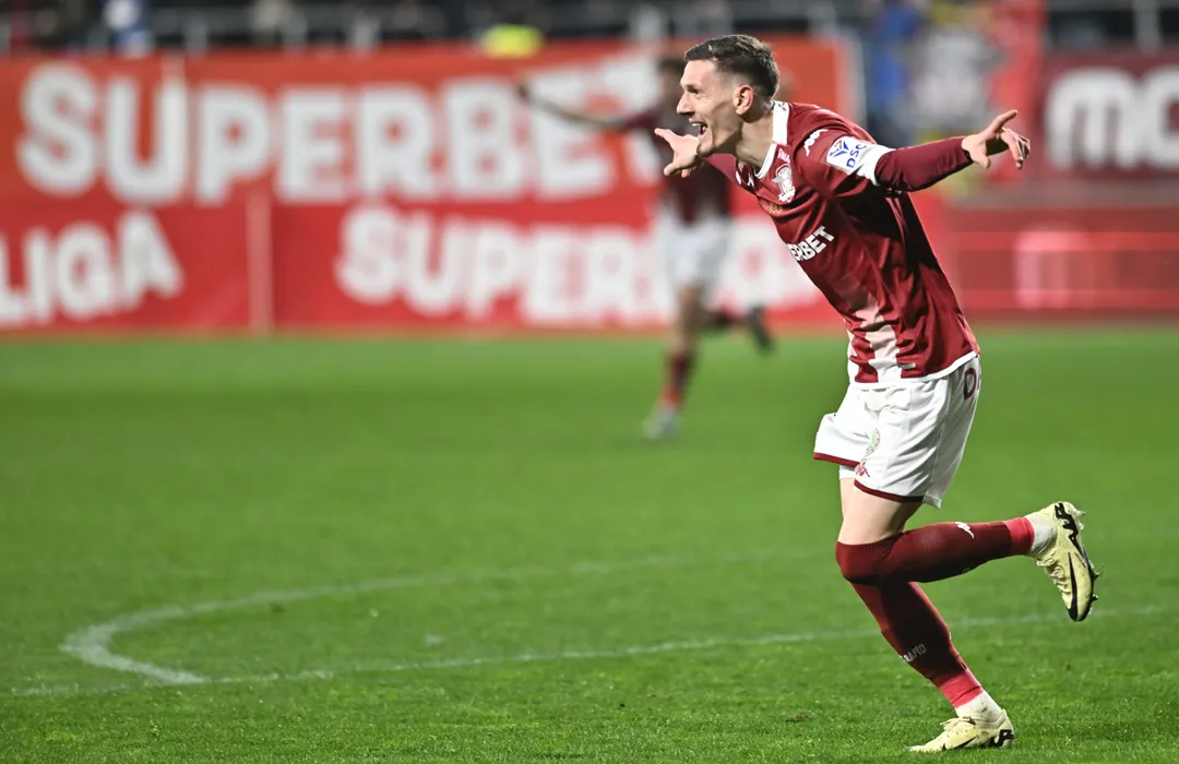 Ermal Krasniqi se bucura dupa un gol marcat in meciul de fotbal dintre Rapid Bucuresti si FC Hermanstadt, din cadrul Superligii Superbet, desfasurat pe Superbet Arena-Giulesti din Bucuresti, vineri 16 februarie 2024. © FOTO:Razvan Pasarica/SPORT PICTURES