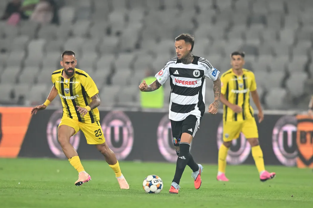 Charalampos Kyriakou si Alessandro Murgia în meciul de fotbal dintre Universitatea Cluj si Dinamo Bucuresti, contând pentru Superliga Superbet, desfășurat pe Cluj Arena din Cluj Napoca, sambata 23 august 2025. © FOTO:Flaviu Buboi/SPORT PICTURES
