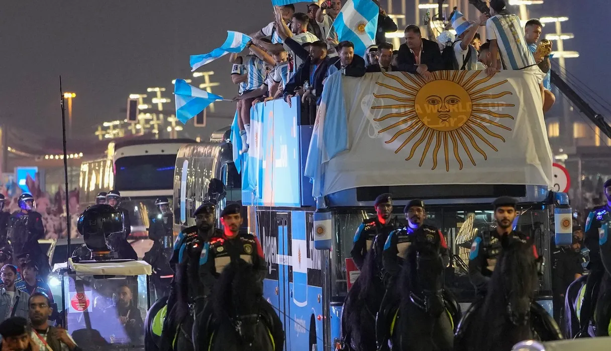 A bus with the celebrating Argentine players, who wave to their fans, travels from the Lusail Stadium after they won the World Cup Final defeating France on penalties, in Lusail, Qatar, Monday, Dec. 19, 2022.,Image: 745447569, License: Rights-managed, Restrictions: This content is intended for editorial use only. For other uses, additional clearances may be required., Model Release: no