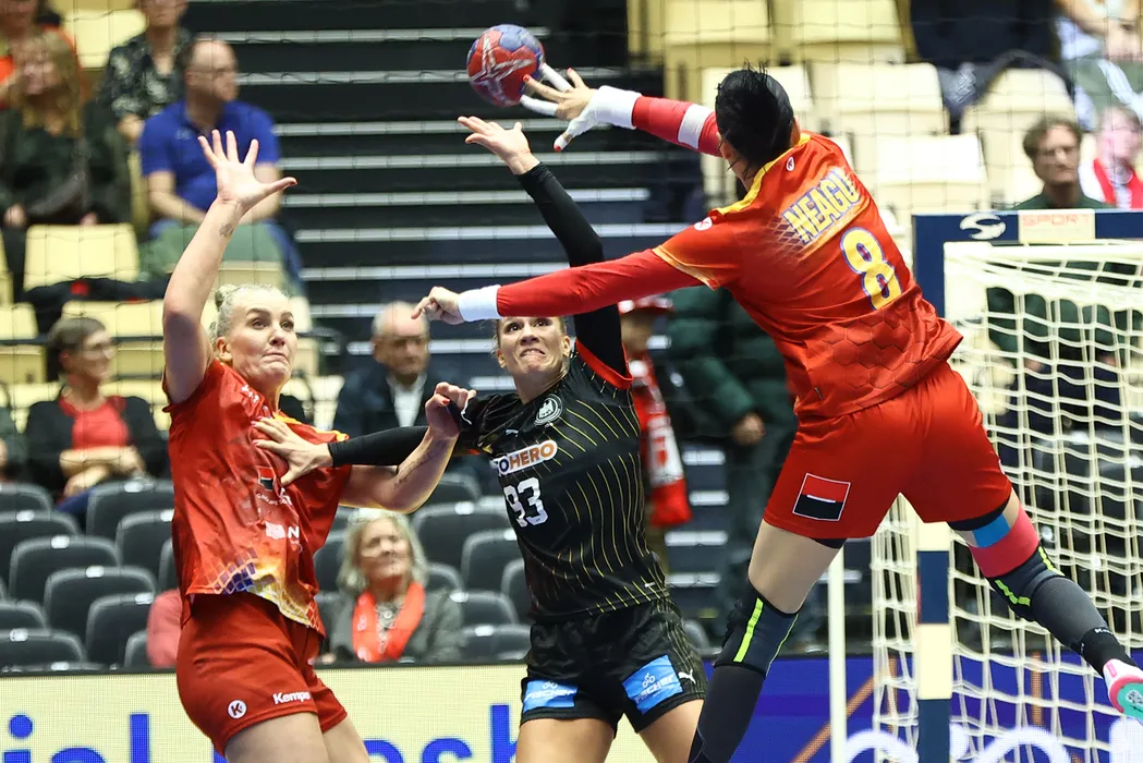 Cristina Neagu, Crina-Elena Pintea și Julia Behnke în meciul de handbal dintre Romania și Germania, contând pentru IHF WOMEN'S WORLD CHAMPIONSHIP 2024, desfășurat în Sala polivalentă Jyske Bank Boxen din Herning, joi 7 decembrie 2023. © FOTO: Sorin PANĂ/SPORT PICTURES