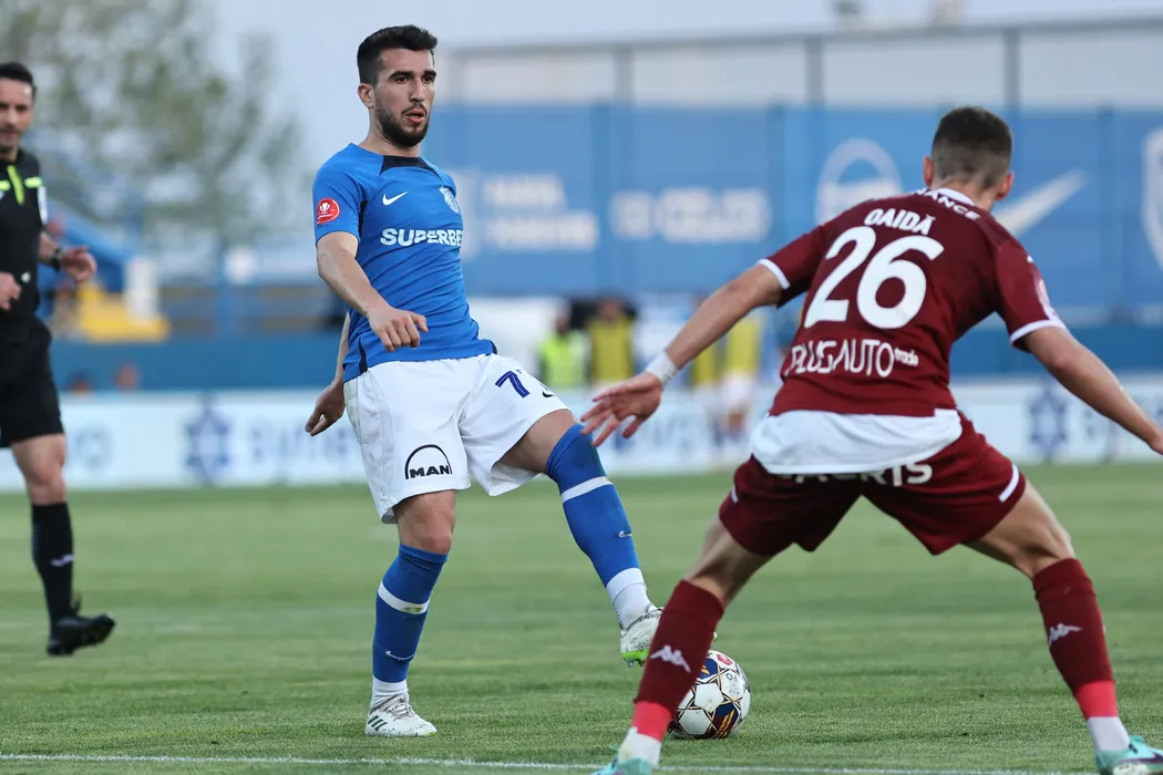 Octavian Ronaldo Andrei Deaconu în meciul de fotbal dintre FC Farul Constanța si FC Rapid 1923 București, contând pentru Superliga Superbet Play-Off, desfășurat pe Stadionul central al Academiei Gheorghe Hagi din Ovidiu, miercuri 24 aprilie 2024. © FOTO: Gică FLUȘTER/SPORT PICTURES