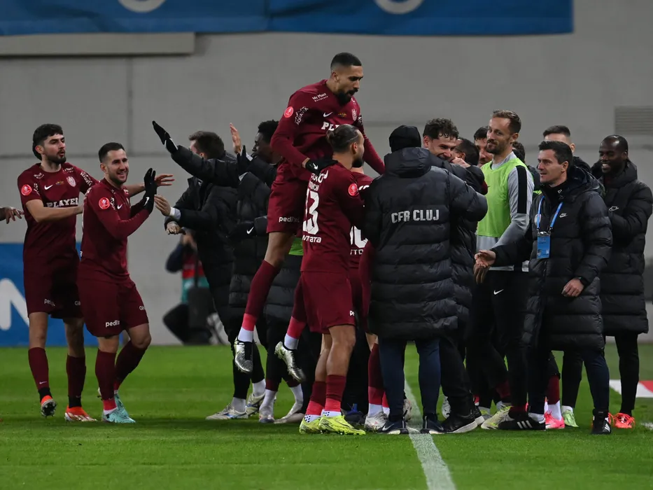 Bucurie a fotbalistilor clujeni Simao Pedro Dias Da Rocha, Constantin Adrian Păun si Bolgado Leonardo Da Costa dupa un gol marcat de catre Matei Christian Ilie in meciul dintre Universitatea Craiova si CFR Cluj, contand pentru Superliga Superbet, desfasurat pe Stadionul Ion Oblemenco din Craiova, duminica 1 decembrie 2024. © FOTO:Razvan Pasarica/SPORT PICTURES