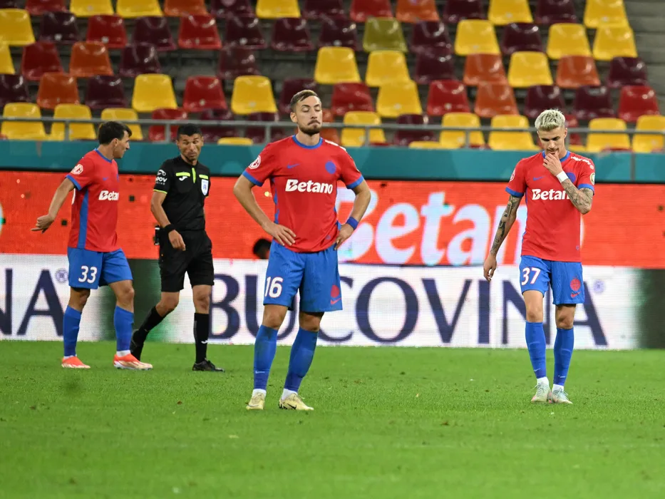 Fotbalistii ros-albastrii Risto Radunovic, Mihai Daniel Lixandru si Octavian George Popescu reacționează dupa un gol incasat in meciul dintre FCSB si FC Arges, contand pentru Superliga Superbet, desfasurat pe Arena Nationala din Bucuresti, duminica 24 august 2025. © FOTO:Razvan Pasarica/SPORT PICTURES