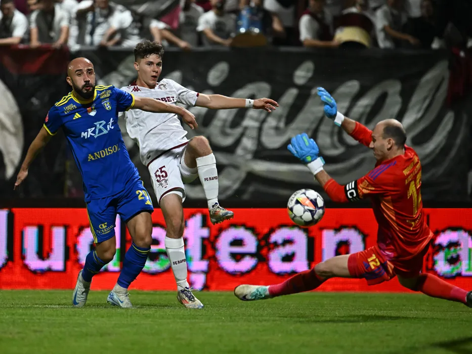 Rareș Mihai Pop marchează un gol de lângă Daniel Marius Serbanica in poarta lui Denis Rusu la meciul dintre Unirea Slobozia si Rapid Bucuresti, contand pentru Superliga Superbet, desfasurat pe Clinceni Arena din Clinceni, luni 23 septembrie 2024. © FOTO:Razvan Pasarica/SPORT PICTURES
