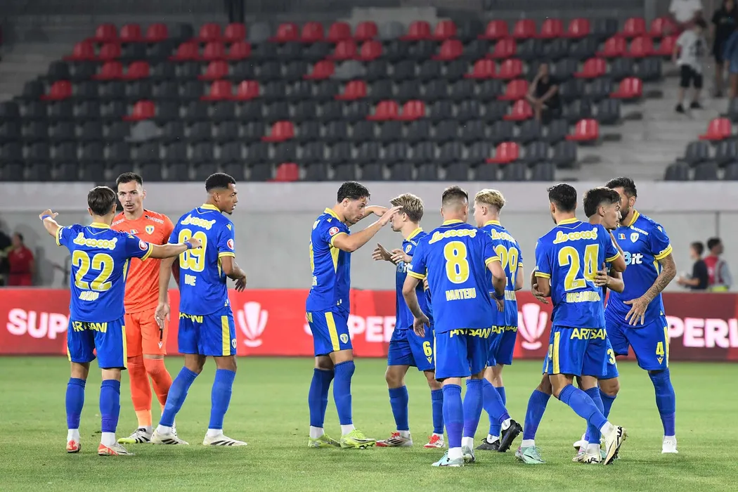 Fotbalistii ploiesteni se incurajeaza inaintea meciului de fotbal dintre FC Universitatea Cluj si Petrolul Ploiesti, contand pentru Superliga Superbet, desfasurat pe Stadionul Municipal din Sibiu, sambata 9 august 2025. © FOTO:Flaviu Buboi/SPORT PICTURES