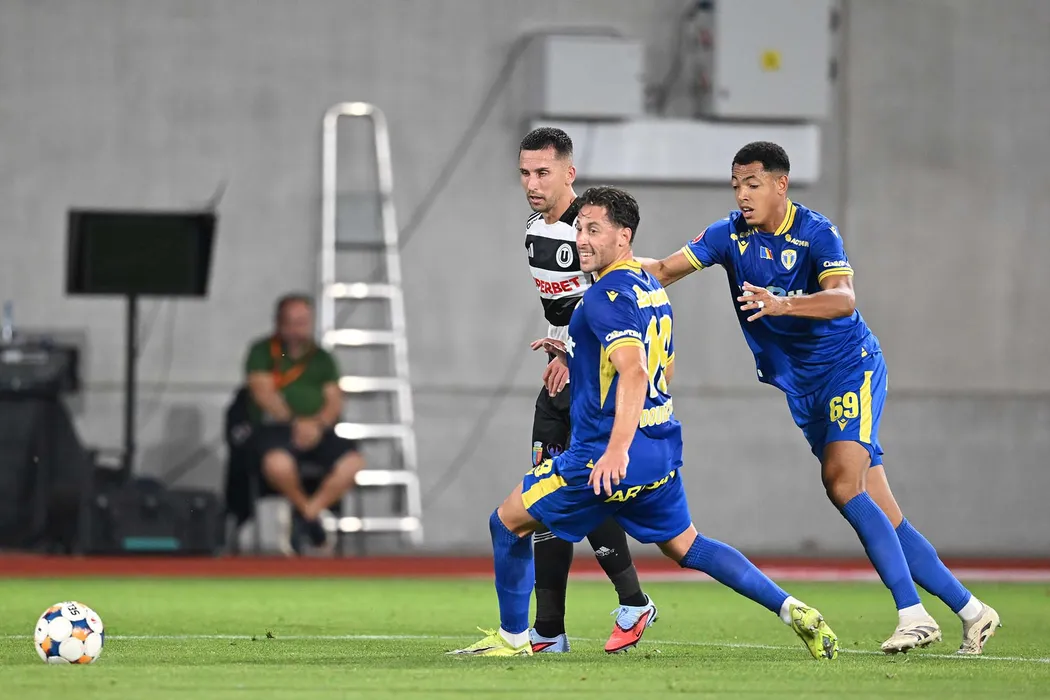 Konstantinos Doumtsios, Cedric Benjamin Roche Yohan si Ovidiu Alexandru Bic in meciul de fotbal dintre FC Universitatea Cluj si Petrolul Ploiesti, contand pentru Superliga Superbet, desfasurat pe Stadionul Municipal din Sibiu, sambata 9 august 2025. © FOTO:Flaviu Buboi/SPORT PICTURES