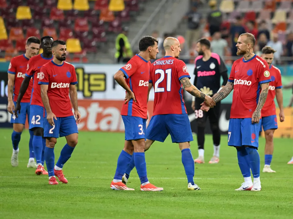 Fotbalistii ros-albastrii Valentin Cretu, Risto Radunovic, Vlad Iulian Chiricheș si Denis Alibec dezamagiti dupa meciul de fotbal dintre FCSB si KF Shkendija, contand pentru Preliminariile Ligii Campionilor, desfasurat pe Arena Nationala din Bucuresti, miercuri 30 iulie 2025. © FOTO:Razvan Pasarica/SPORT PICTURES