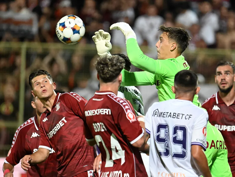 Mihai Alexandru Dobre si Franz Stolz in meciul de fotbal dintre FC Arges si Rapid Bucuresti, contand pentru Superliga Superbet, desfasurat pe Stadionul Orasenesc din Mioveni, vineri 11 iulie 2025. © FOTO:Razvan Pasarica/SPORT PICTURES