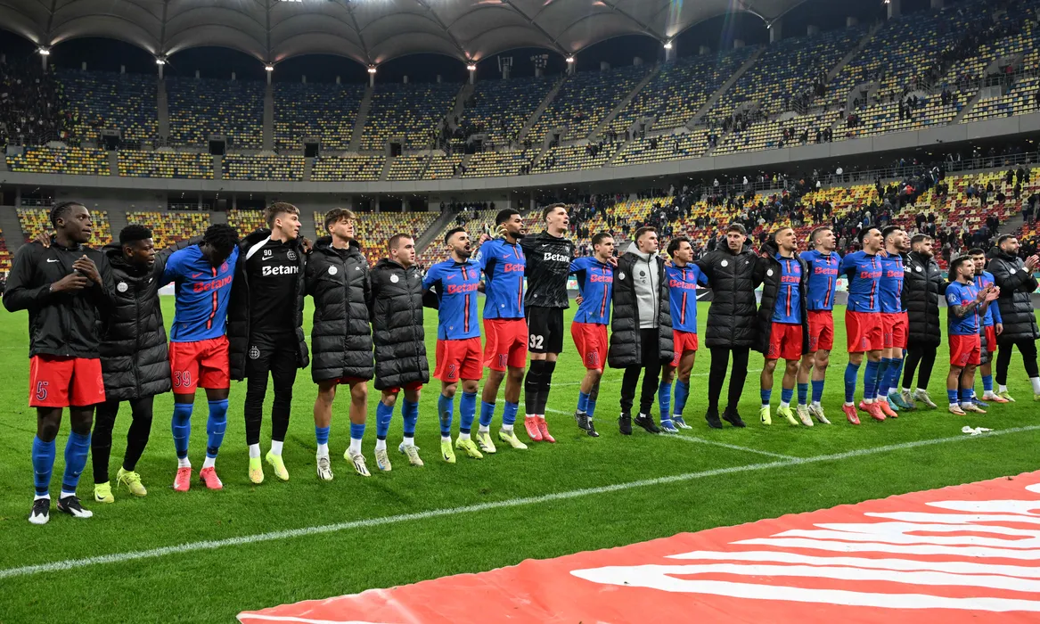 Fotbaliștii ros-albastrii Joyskim Aurelien Dawa Tchakonte, Enagnon David Kiki, Jordan Youri Gele, Alexandru Constantin Stoian, Mihai Vlăduț Toma, Valentin Cretu, Malcolm Sylas Laouari Edjouma, Ștefan Târnovanu, Juri Cisotti, Andrei Cosmin Gheorghita, Risto Radunovic, David Raul Miculescu, George Daniel Bîrligea, Florin Lucian Tănase, Adrian Gheorghe Șut, Adrian Gheorghe Șut, Mihai Popescu, Mihai Răzvan Udrea, Alexandru Mihail Baluță, Alexandru Marian Musi si Lukas Zima salută galeria după meciul de fotbal dintre FCSB si Rapid Bucuresti, contand pentru Play off-ul Superligii Superbet, desfasurat pe Arena Nationala din Bucuresti, duminica 16 martie 2025. © FOTO:Razvan Pasarica/SPORT PICTURES