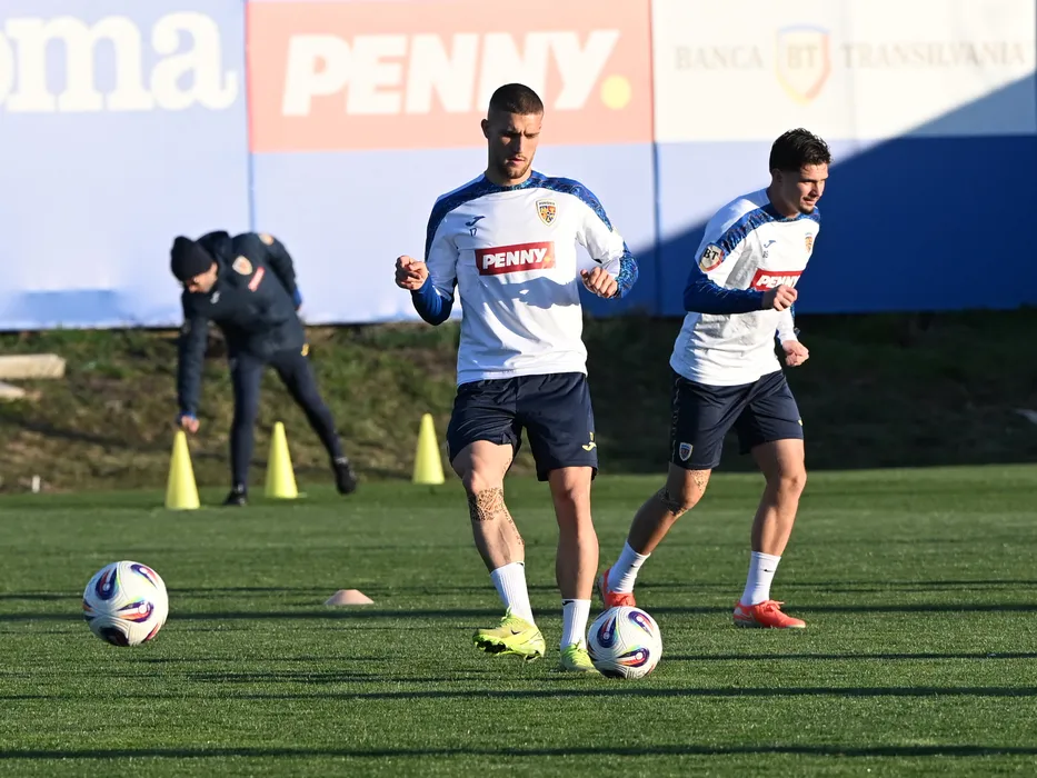 Fotbalistii romani Daniel Birligea si Răzvan Marin la un antrenament efectuat inaintea meciurilor impotriva Bosniei Hertegovina si San Marino, din cadrul Preliminariilor Campionatului Mondial 2026, desfasurat la Centrul National de Fotbal de la Mogosoaia, joi 20 martie 2025. © FOTO:Razvan Pasarica/SPORT PICTURES