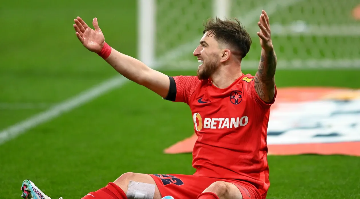 Deian Cristian Sorescu reactioneaza la pamant in meciul de fotbal dintre FCSB si Universitatea Craiova, contand pentru Play-off-ul Superligii Superbet, desfasurat pe Arena Nationala din Bucuresti, sambata 18 martie 2023. © FOTO:Razvan Pasarica/SPORT PICTURES