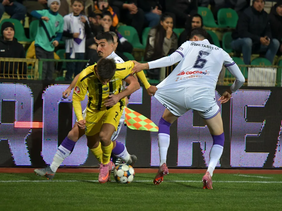 Alexandru Marian Musi si Ionut Marius Briceag, Mario Cristian Tudose in meciul de fotbal dintre FC Arges si Dinamo Bucuresti, contand pentru Superliga Superbet, desfasurat pe Stadionul Orasenesc din Mioveni, vineri 24 octombrie 2025. © FOTO:Mihai Nitoiu/SPORT PICTURES