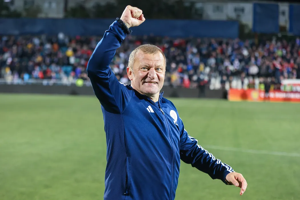 Dorinel Ionel Munteanu sărbătorește alături de suporteri după victoria obținută în meciul de fotbal dintre SC Oțelul Galați și FC Uniuversitatea Cluj, contând pentru Cupa României Betano - semifinală, Stadionul Oțelul din Galați, joi 18 aprilie 2024. © FOTO: Sorin PANĂ/SPORT PICTURES
