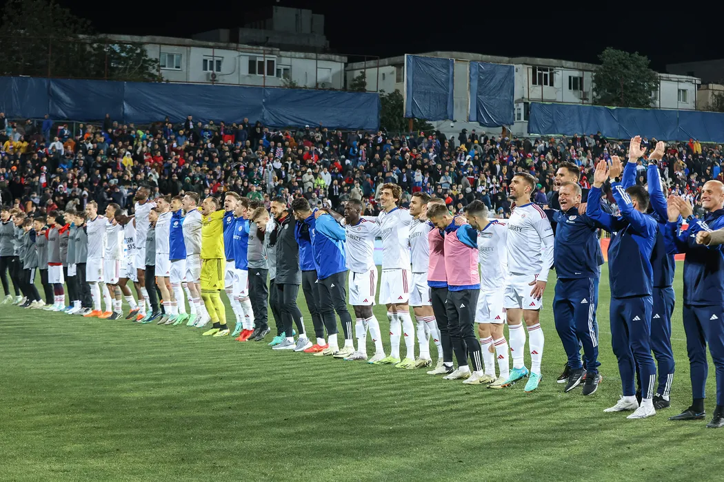 Fotbaliștii gălățeni salută galeria după victoria obținută în meciul de fotbal dintre SC Oțelul Galați și FC Uniuversitatea Cluj, contând pentru Cupa României Betano - semifinală, Stadionul Oțelul din Galați, joi 18 aprilie 2024. © FOTO: Sorin PANĂ/SPORT PICTURES