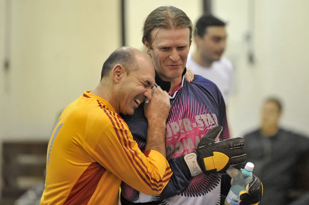 Ion "Jean" Vladoiu (S) alaturi de Rafael (D) reactioneaza in timpul meciului demonstrativ de fotbal disputat intre USR (Uniunea Studentilor din Romania) vs. Artisti vs. Gloriile fotbalului romanesc, la sala de sport din Academia de Studii Economice din Bucuresti, marti, 20 noiembrie 2012. ANDREEA ALEXANDRU / MEDIAFAX FOTO