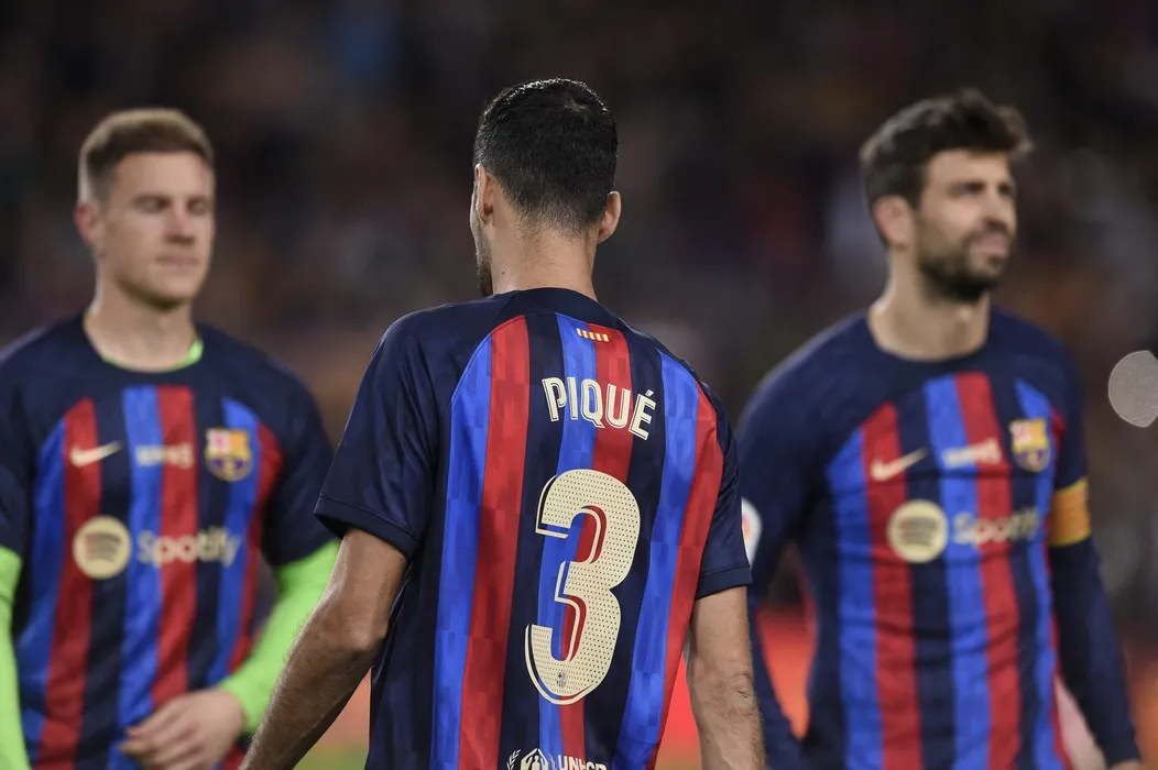 Barcelona's players wear Spanish defender Gerard Pique jersey prior the Spanish league football match between FC Barcelona and UD Almeria at the Camp Nou stadium in Barcelona on November 5, 2022. Barcelona's Pique plays his last match as he announced his retirement after stellar career.,Image: 735469806, License: Rights-managed, Restrictions: , Model Release: no