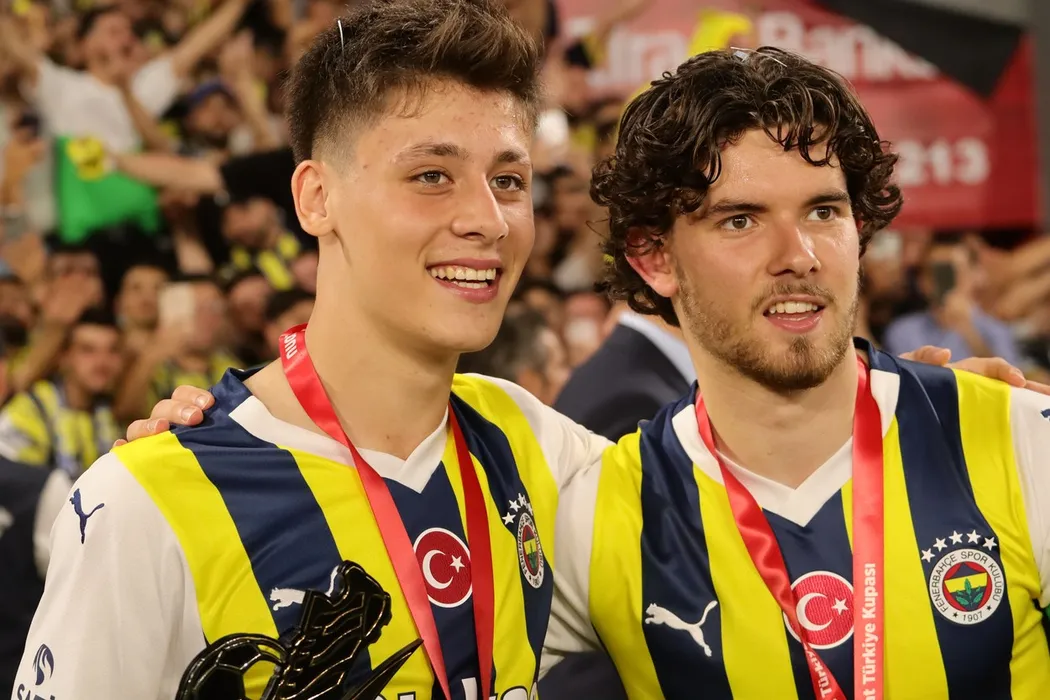 Arda Guler (L) and Ferdi Kadioglu of Fenerbahce during the Ziraat Turkish Cup Final Match between Fenerbahce and Basaksehir at Göztepe Gürsel Aksel Stadium on June 11, 2023 in Izmir, Turkey. (Photo by Seskimphoto ),Image: 782944108, License: Rights-managed, Restrictions: TURKEY OUT, Model Release: no