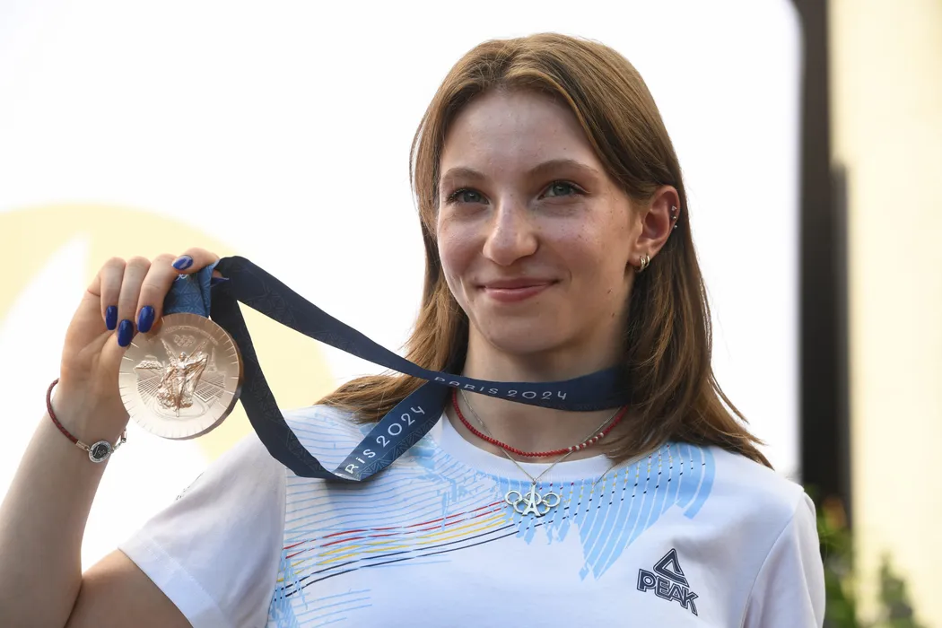 Ana Maria Bărbosu prezintă medalia de bronz la festivitatea de premiere, eveniment organizat pe esplanada Casei Olimpice din București, vineri 16 august 2024. © FOTO: SPORT PICTURES