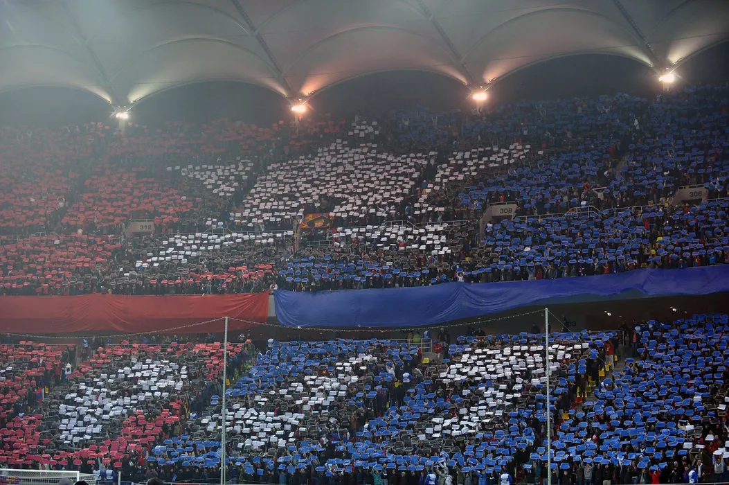 Romanian supporters raise coloured pannels drawing the flag of Steaua Bucuresti prior to the match against AEK Larnaca of UEFA Europa League football match in Bucharest on December 14, 2011. Steaua won 3-1. AFP PHOTO DANIEL MIHAILESCU,Image: 109363624, License: Rights-managed, Restrictions: , Model Release: no