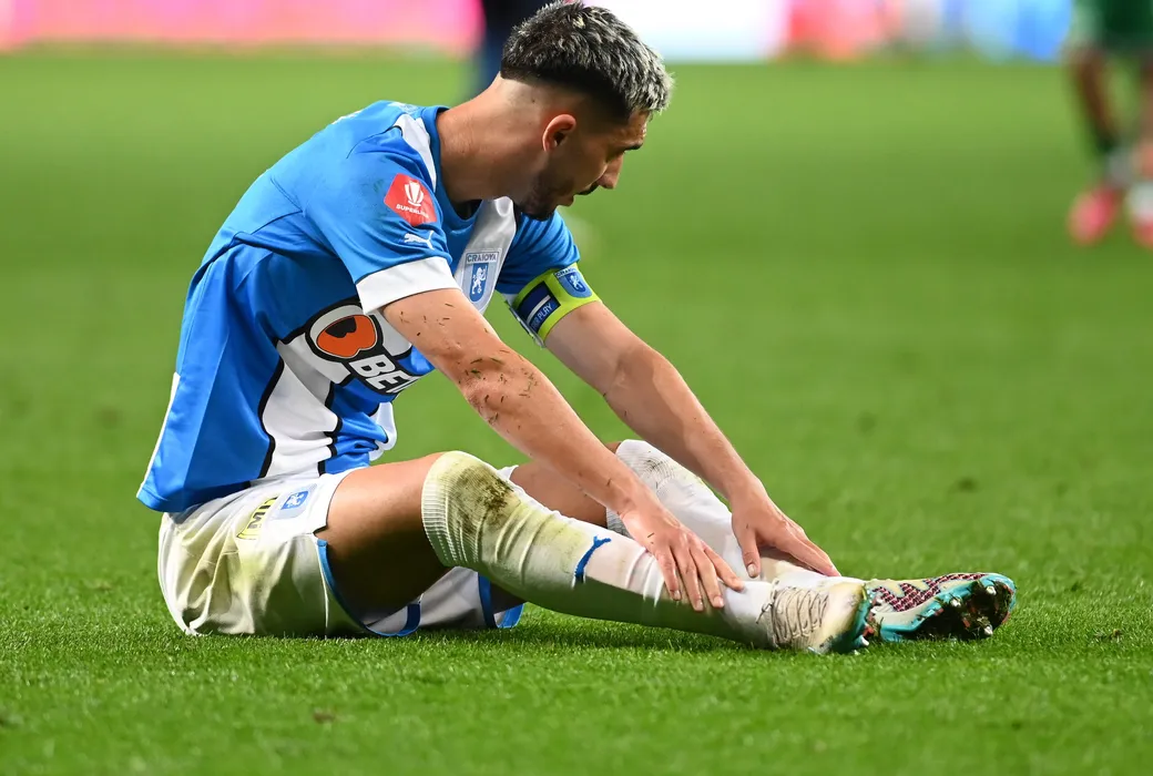 Andrei Virgil Ivan la pamant dupa meciul de fotbal dintre Universitatea Craiova si Farul Constanta, contand pentru Play-off-ul Superligii Superbet, desfasurat pe Stadionul Ion Oblemenco din Craiova, sambata 13 mai 2023. © FOTO:Razvan Pasarica/SPORT PICTURES