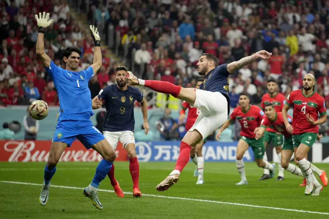 France's Theo Hernandez, center, scores the opening goal during the World Cup semifinal soccer match between France and Morocco at the Al Bayt Stadium in Al Khor, Qatar, Wednesday, Dec. 14, 2022. (AP Photo/Christophe Ena)