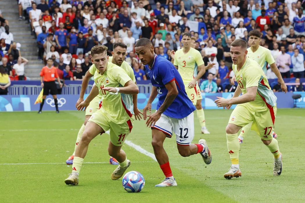 Enzo Millot of France and Fermín López, Sergio Gómez of Spain, Football, Men's Gold Medal Match between France and Spain during the Olympic Games Paris 2024 on 9 August 2024 at Parc des Princes in Paris, France - Photo Gregory Lenormand / Panoramic / Bestimage,Image: 897549106, License: Rights-managed, Restrictions: , Model Release: no
