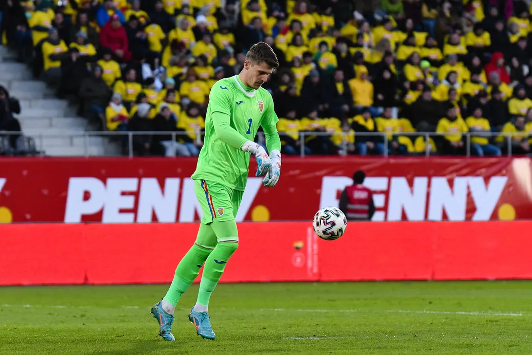 Portarul Stefan Tarnovanu, de la Romania U21, suteaza in timpul meciului amical de fotbal contra Germania U21, disputat pe stadionul Municipal din Sibiu, marti, 28 martie 2023. FLAVIU BUBOI / MEDIAFAX FOTO