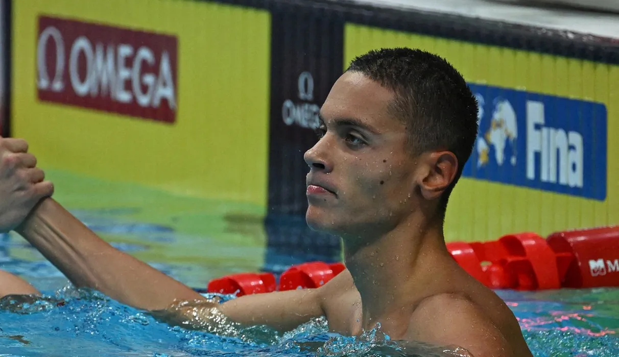 Romania's David Popovici (R) is congratulated after taking gold in the men's 100m freestyle finals during the Budapest 2022 World Aquatics Championships at Duna Arena in Budapest on June 22, 2022.,Image: 701936957, License: Rights-managed, Restrictions: , Model Release: no, Credit line: Profimedia