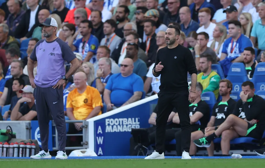 Liverpool manager Jurgen Klopp (left) and Brighton and Hove Albion manager Roberto De Zerbi on the touchline during the Premier League match at The AMEX, Brighton. Picture date: Sunday October 8, 2023.,Image: 811999780, License: Rights-managed, Restrictions: EDITORIAL USE ONLY No use with unauthorised audio, video, data, fixture lists, club/league logos or "live" services. Online in-match use limited to 120 images, no video emulation. No use in betting, games or single club/league/player publications., Model Release: no