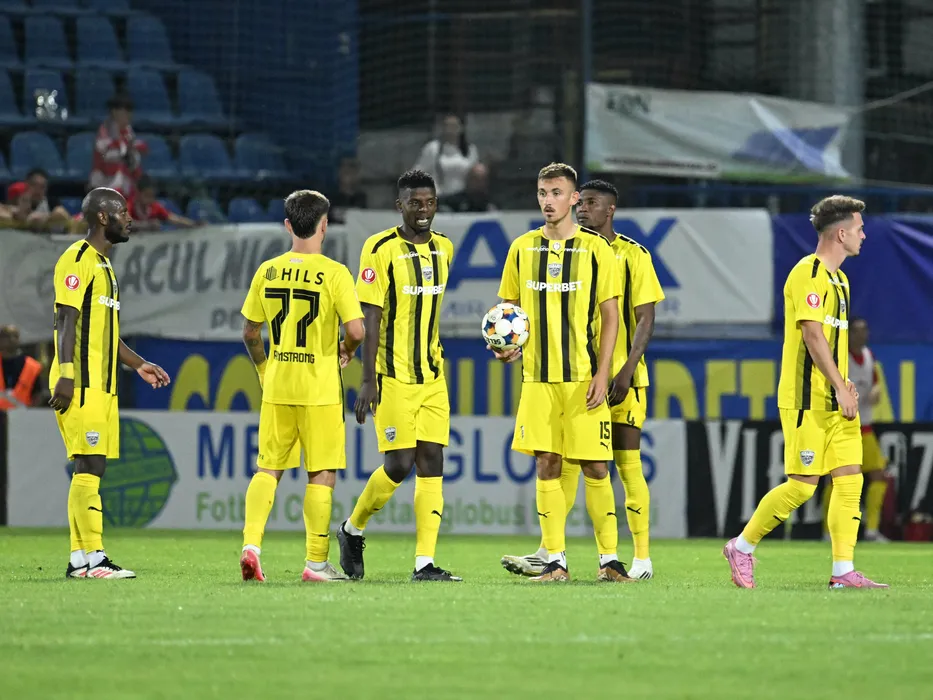 Fotbalistii dinamovisti Jordan Ikoko, Danniel Charles Armstrong, Vhakka Eddy Stelh Gnahore, Kennedy Kofi Boateng, Nikita Stoinov si Alexandru Mihai Constantin Pop discuta la meciul de fotbal dintre Metaloglobus Bucuresti si Dinamo Bucuresti, contand pentru Superliga Superbet, desfasurat pe Clinceni Arena din Clinceni, vineri 8 august 2025. © FOTO:Razvan Pasarica/SPORT PICTURES