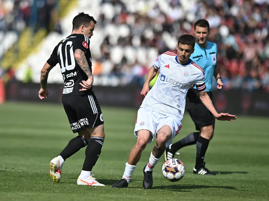 Dan Nicolae Nistor si Juri Cisotti in meciul de fotbal dintre Otelul Galati si Universitatea Cluj, din cadrul Play-out-ului Superligii Superbet, desfasurat pe Stadionul Otelul din Galati, duminica 21 aprilie 2024. © FOTO:Razvan Pasarica/SPORT PICTURES