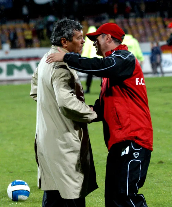 Antrenorii celor doua formatii Mircea Lucescu si Mircea Rednic se imbratiseaza la finalul partidei.