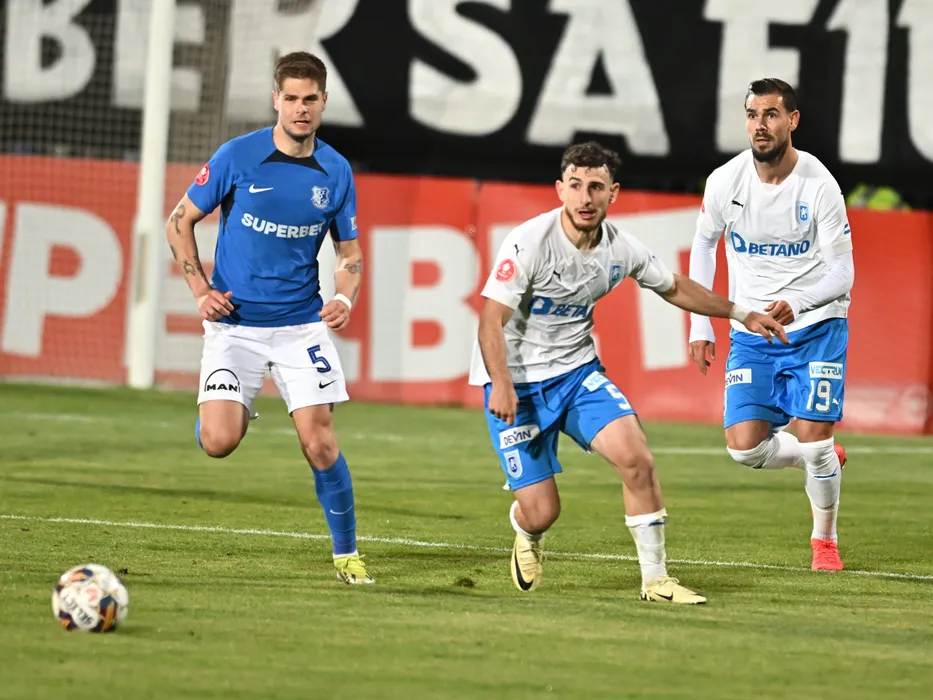 Diogo Lucas Queiros, Anzor Mekvabishvili si Elvir Koljic in meciul de fotbal dintre Farul Constanta si Universitatea Craiova, contand pentru Play off-ul Superligii Superbet, desfasurat pe Stadionul central al Academiei Gheorghe Hagi din Ovidiu, luni 13 mai 2024. © FOTO:Razvan Pasarica/SPORT PICTURES