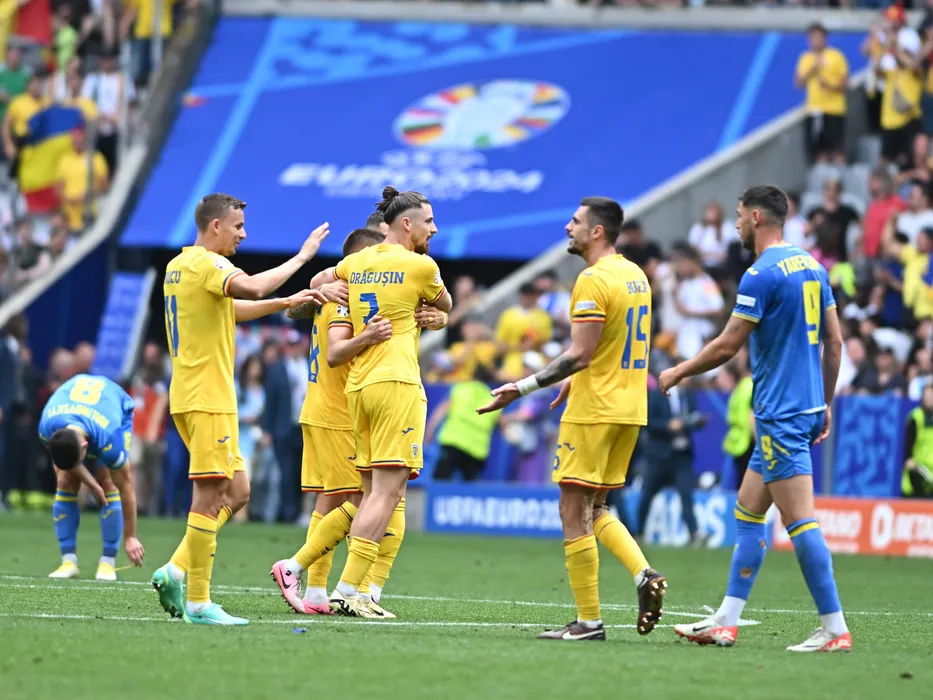 Bucurie a fotbalistilor romani Nicușor Bancu, Radu Drăgușin si Andrei Burca dupa meciul dintre Romania si Ucraina, din cadrul UEFA EURO 2024, desfasurat pe Fussball Arena din Munchen, luni 17 iunie 2024. © FOTO:Razvan Pasarica/SPORT PICTURES