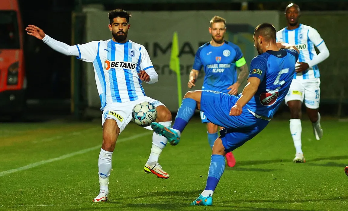 Ionut Daniel Vina si Catalin Andrei Ion in meciul de fotbal dintre Academica Clinceni si Universitatea Craiova, contand pentru Liga 1 Casa Pariurilor, desfasurat pe Stadionul Marin Anastasovici din Giurgiu, luni 21 februarie 2022. © FOTO:Gheorghe Fluster/SPORT PICTURES