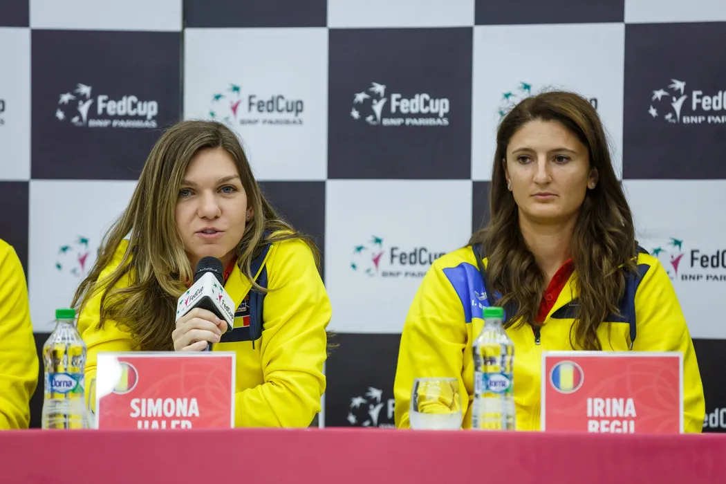 Simona Halep (S) si Irina Begu (D) participa la tragerea la sorti pentru intalnirea de Fed Cup Romania - Elvetia, din cadrul play-off-ului Grupei Mondiale a Fed Cup, vineri, 20 aprilie 2018, in Cluj-Napoca. DAN HORIA TAUTAN / MEDIAFAX FOTO