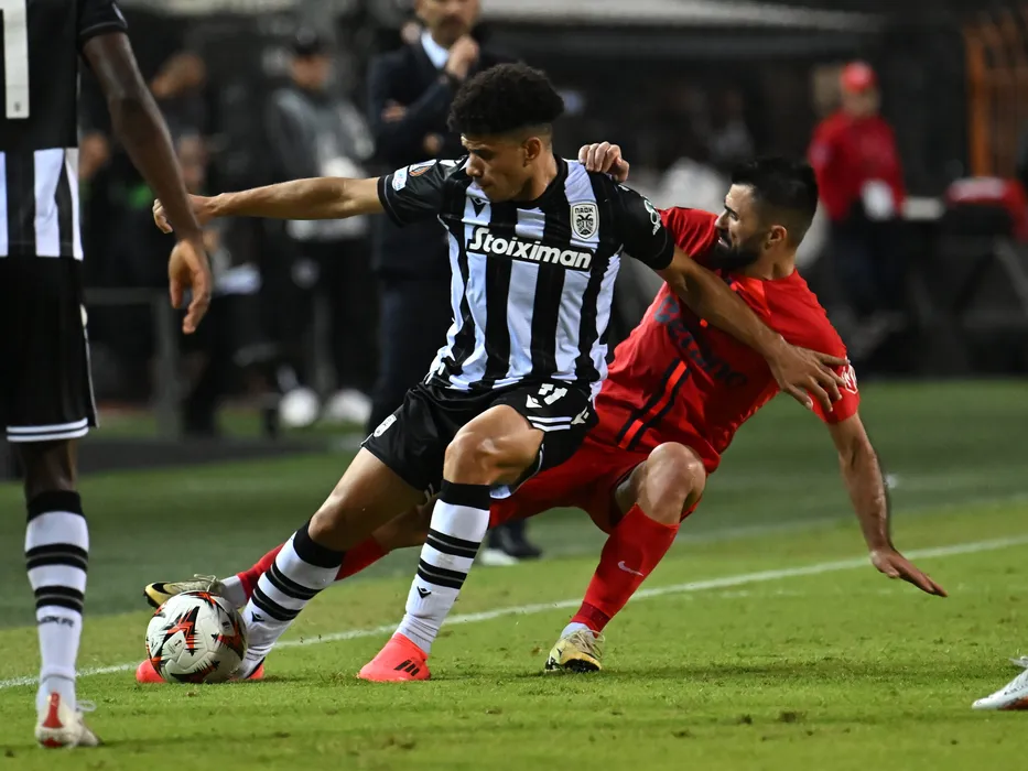 Taison si Valentin Crețu in meciul dintre PAOK Salonic si FCSB, din cadrul UEFA Europa League, desfasurat pe Stadionul Toumba din Salonic, joi 3 octombrie 2024. © FOTO:Razvan Pasarica/SPORT PICTURES