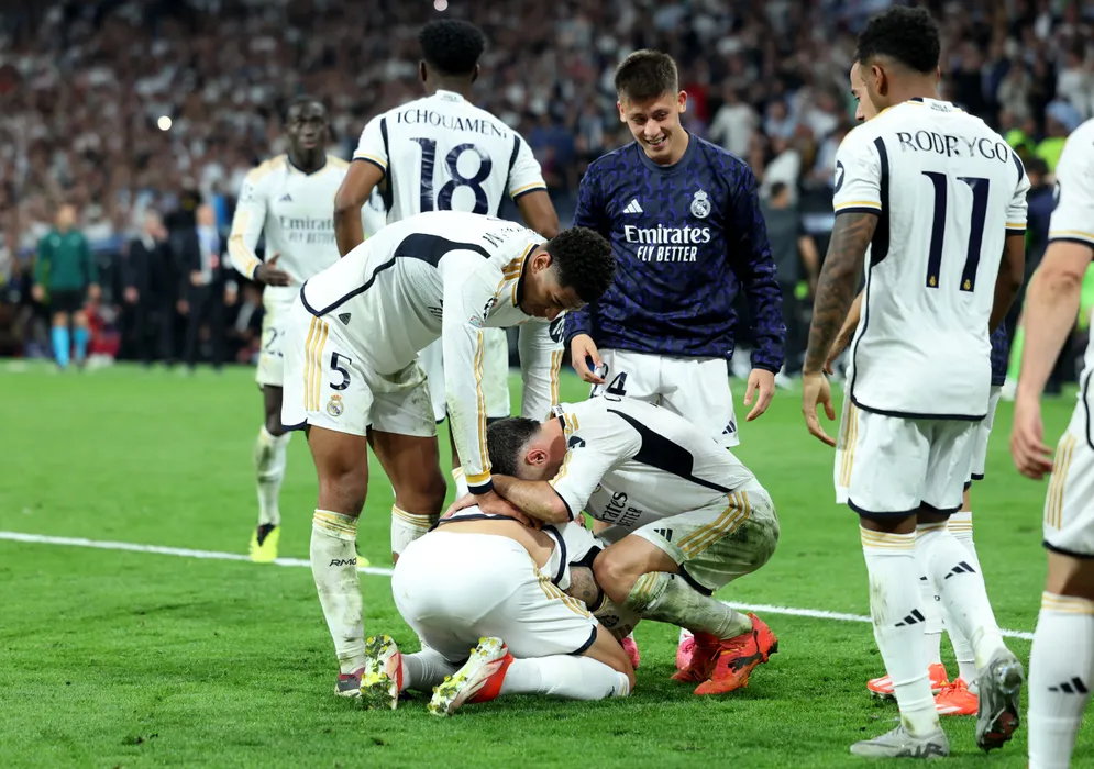 08 May 2024, Spain, Madrid: Real Madrid's Joselu (on ground) is congratulated by team-mates after scoring their second goal during the UEFA Champions League semi-final, second leg match between Real Madrid and Bayern Munich at the Santiago Bernabeu. Photo: Isabel Infantes/PA Wire/dpa