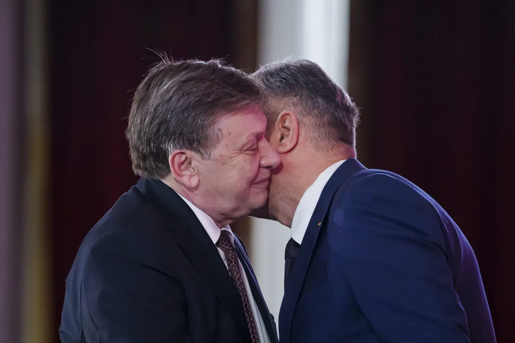 Presedintele PSD, Marcel Ciolacu il saluta pe Crin Antonescu in timpul Congresului Partidului Social Democrat de desemnare a candidatului PSD pentru alegerile prezidentiale, in Bucuresti, duminica, 2 februarie 2025. ANDREEA ALEXANDRU / MEDIAFAX FOTO